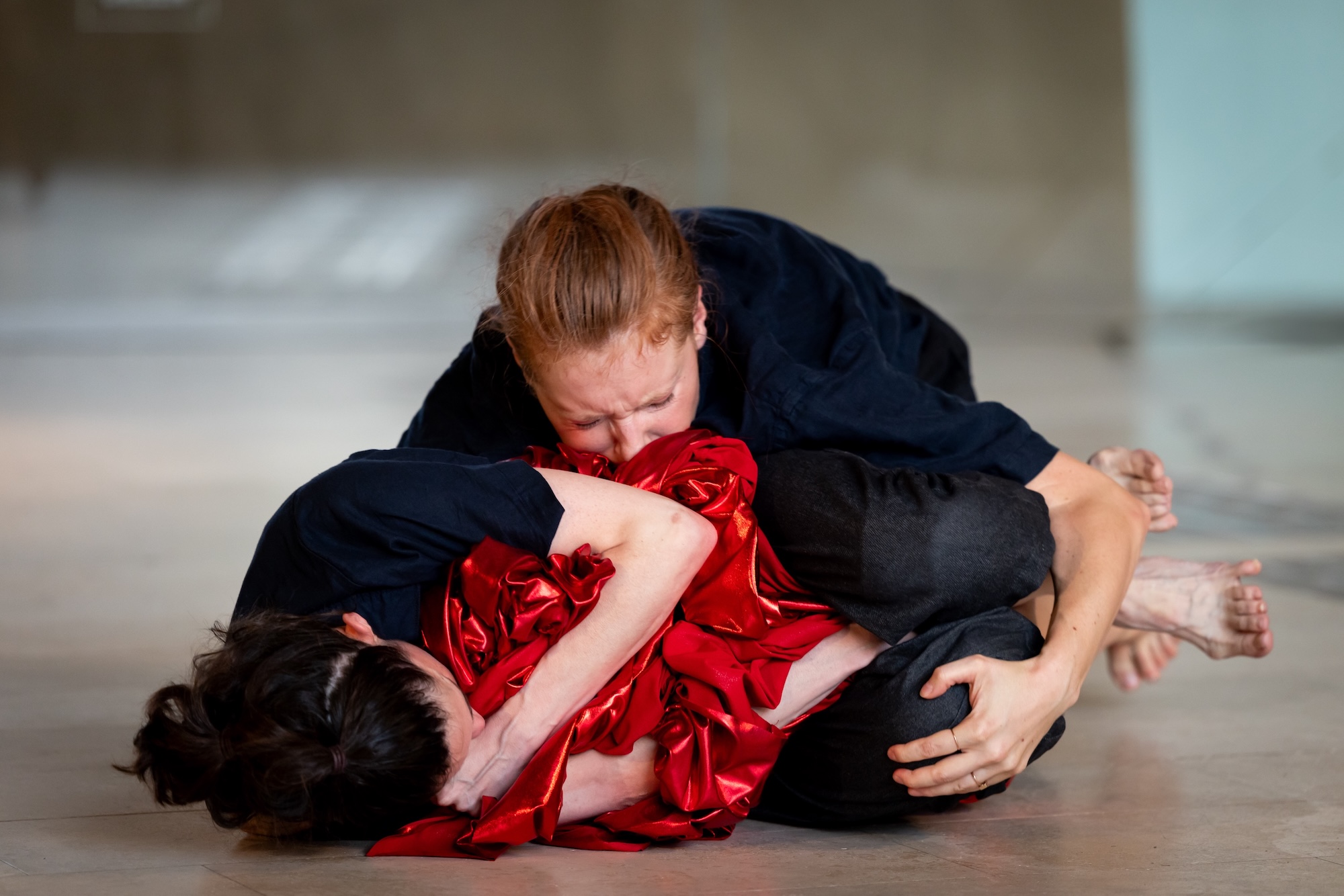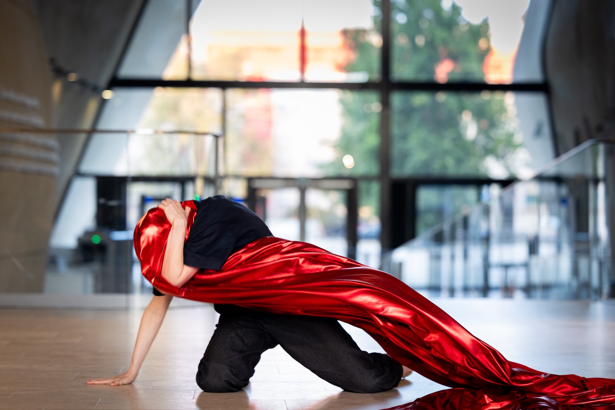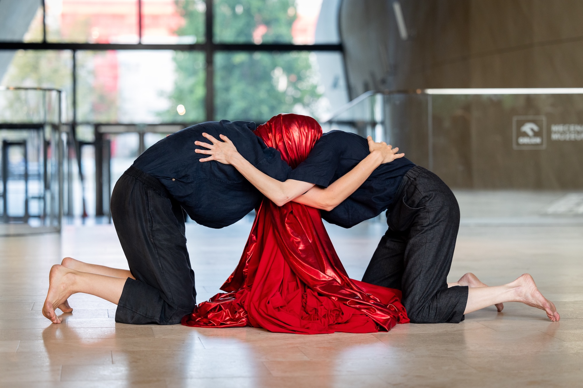 Two dancers and a double bass player give physical form to lost, repressed, or fragmented memories. Buried and forgotten stories slowly resurface. Fragments rearrange themselves. What has long remained unspoken is translated into movement. The fabric becomes the connecting element - skin, boundary, protection, and resonance chamber all at once. It reminds us of what separates us and what sustains us. This creates an intimate bridge: A dance about memory, connection, and transformation, about identity.